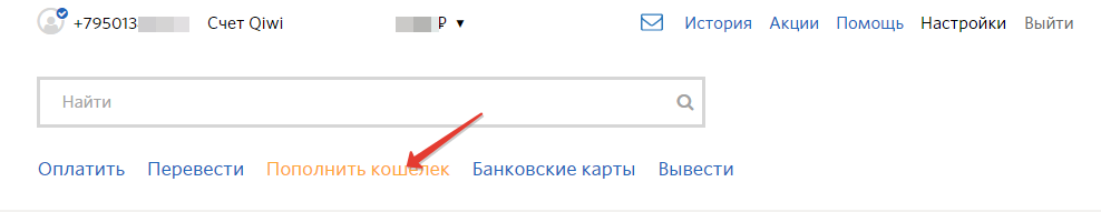 Авторизуйтесь в своем профиле Qiwi и кликните по ссылке «Пополнить кошелек» в верхнем меню.