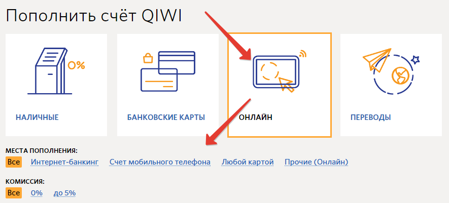 Выберите раздел «Онлайн», чтобы перевести средства с мобильного телефона или банковской карты. Для удобства можно воспользоваться фильтром и указать место пополнения – счет мобильного телефона.