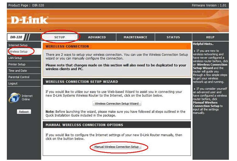 Кликните на вкладке “Setup”, выберите меню “Internet Setup” и, в завершении кликните на «Manual Internet Connection Setup».