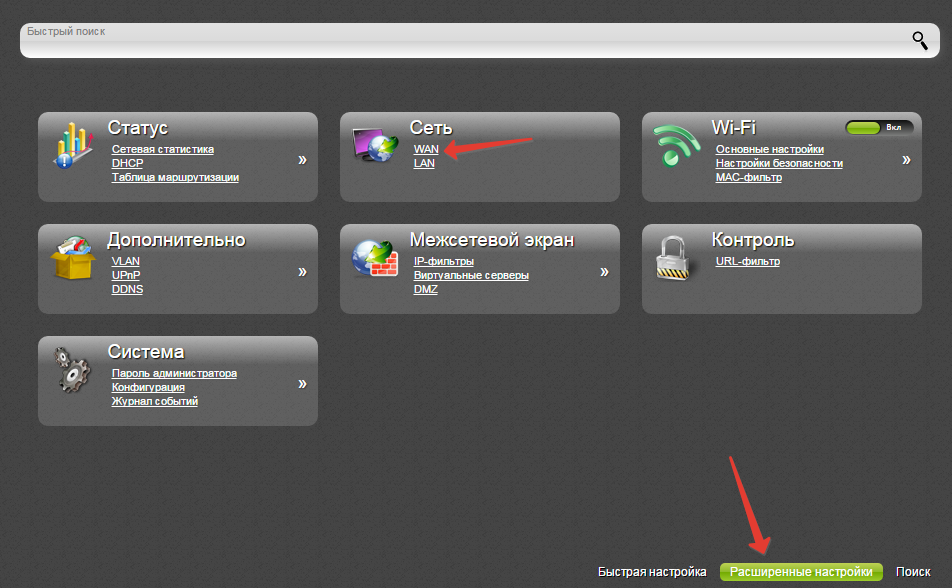 Вы попадете в веб-интерфейс маршрутизатора, в котором будет производиться основная настройка роутера D Link DIR 300 Ростелеком. Чтобы установить соединение вручную, перейдите к расширенным настройкам. Далее: