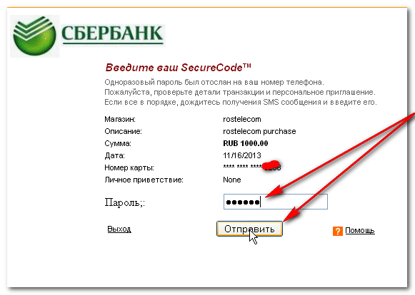Если ваш выбор упал на банковскую карту, сразу после ввода данных и подтверждения нажатием кнопки «Оплатить», на ваш мобильный телефон придет SMS с одноразовым паролем для входа.