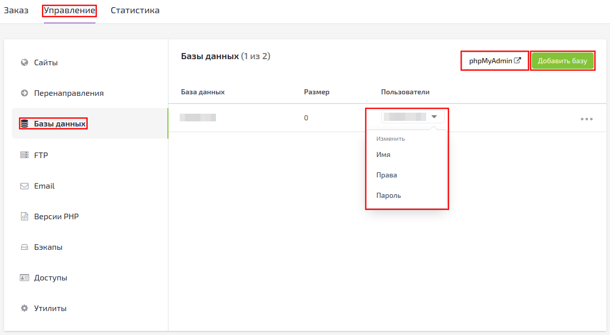 • Здесь вы можете Выполнять операции с БД, а именно Добавить новую базу данных, Добавить пользователя БД. Изменить имя, пароль или назначить права.