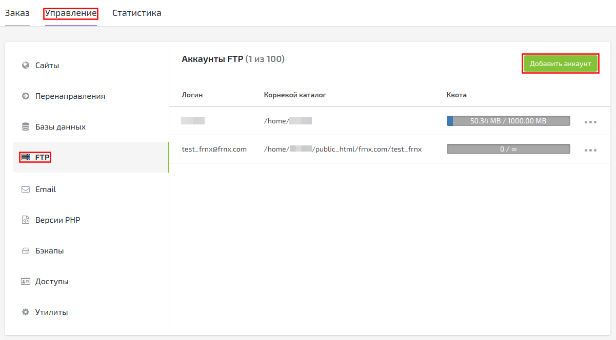 • Возможность добавить или удалить FTP-аккаунт, указать Имя пользователя, Корневой каталог и квоту на дисковое пространство для аккаунта.