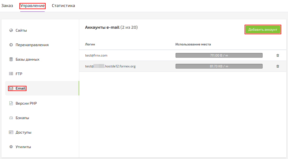 • Здесь у вас также есть возможность добавить или удалить Email-аккаунт, указать Email для домена и квоту на дисковое пространство для аккаунта.