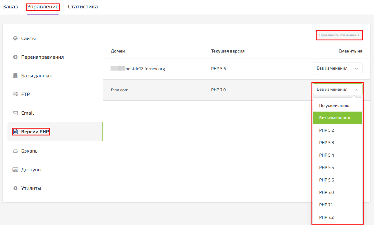 • В этом меню вы можете указывать версию PHP для домена. По умолчанию на хостинге указана версия PHP 5.6