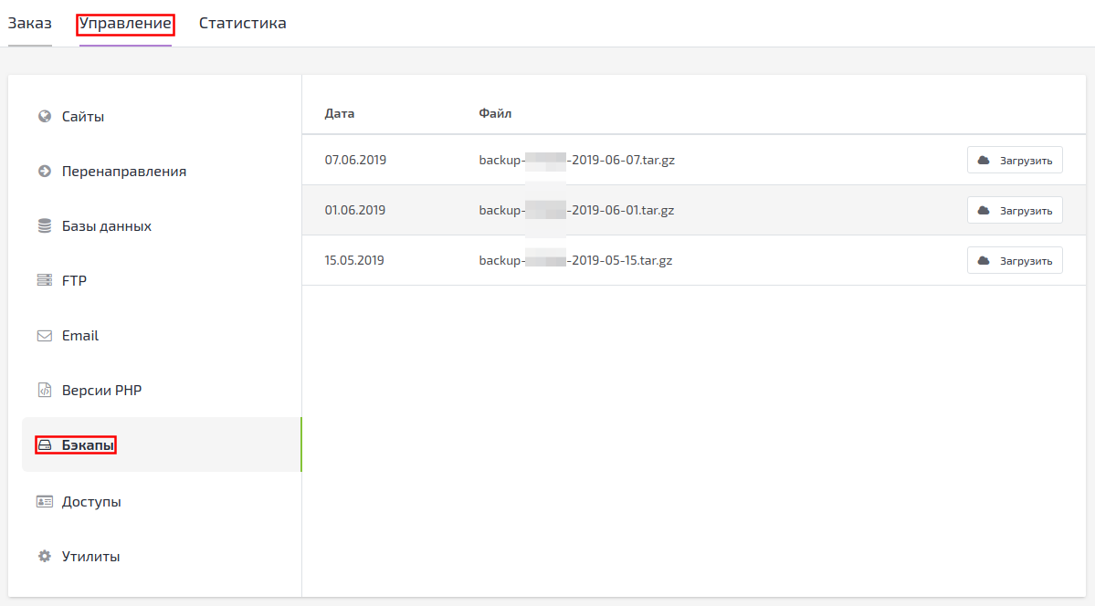 • В этом разделе у вас есть возможность скачивать резервные копии всех данных вашего заказа VH (сайтов, SSL-сертификатов, почтовых ящиков, баз данных).
