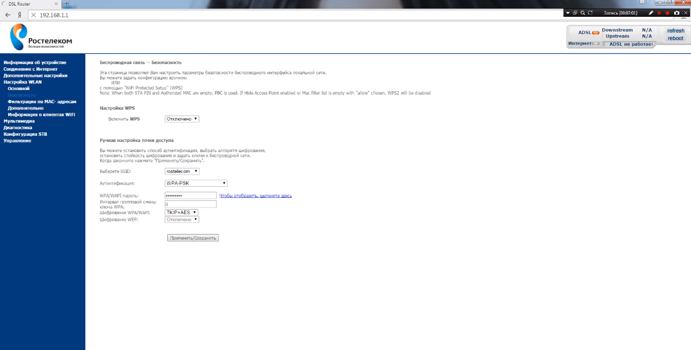 Для настройки конфигурации и универсальной настройки Wi-Fi роутера Sagemcom от Ростелеком надо перейти в раздел «Основной» категории WLAN, где придется включить беспроводную сеть и передачу мультикаста (эти пункты вы найдете без проблем). В категории «Безопасность» остается указать варианты аутентификации (WPA-PSK) и метод шифрования (TKIP и AES). После введения ключа доступа, состоящего, минимум, из восьми символов, настройки можно сохранить, нажав одноименную кнопку. На этом настройку маршрутизатора можно считать законченно, но чтобы убедиться, что с несложной задачей, как настроить роутер Sagemcom f st 2804 v7 rev 1 от Ростелеком, вы справились, необходимо выполнить перезагрузку – в разделе «Управление» нажать соответствующую кнопку. После перезагрузки можно приступать к работе.