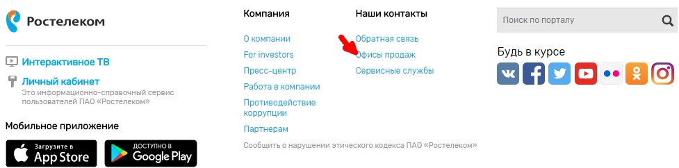 https://rt.ru – в нижней части страницы, в разделе «Офисы продаж». Предварительно в правом верхнем углу страницы нужно указать населенный пункт, где подключена услуга.