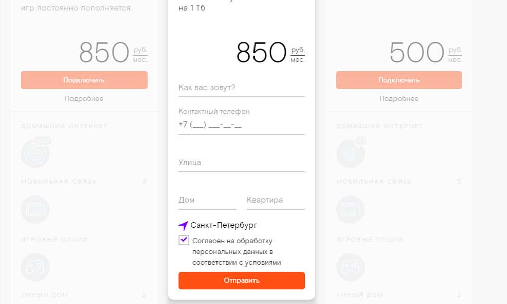 1. Онлайн. Перейдите на https://spb.rt.ru/homeinternet/. В карусели тарифов выберите соответствующий и нажмите «Подключить». На странице откроется форма для ввода личных данных – понадобятся ФИО, адрес и контактный телефон. Заполняйте и кликайте по «Отправить». В ближайшее время с вами свяжется специалист, чтобы обговорить детали и дату визита мастера настройки оборудования.
