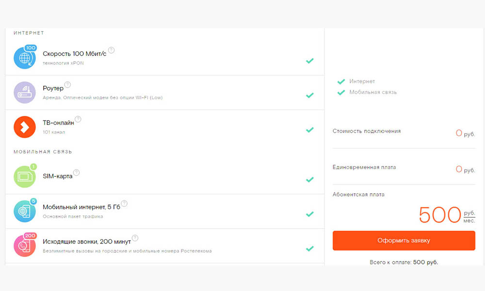 В базовый набор тарифа «Для интернета везде» Ростелеком добавил домашнее подключение на высокой скорости и бесплатный мобильный доступ ко Всемирной паутине. В качестве бонуса абоненты также получают интерактивное телевидение, безлимитные звонки на другие телефоны оператора и возможность настроить план под потребности, разбавив предустановленные опции дополнительными. За 500 руб./мес. провайдер обещает обслуживать клиентов на следующих условиях.